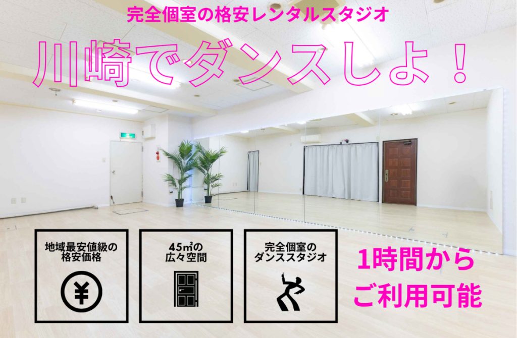 川崎駅のレンタルスタジオです。大型鏡とフローリングでダンスに最適な空間です。